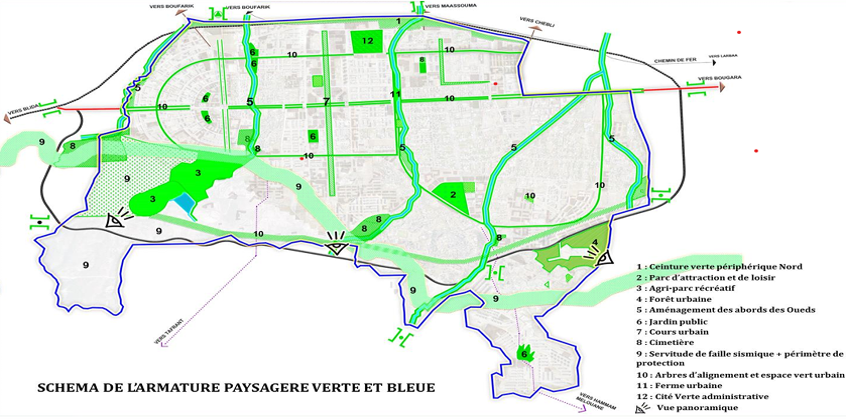 Au sud, sur les hauteurs de la ville existante, la zone de protection incluant des zones boisées, un agri-parc et le parc du lac de Amroussa permettent de préserver le paysage naturel. Les Oueds traversant la VNB qui sont de l’ordre de cinq (Oued M’halla, Oued Amroussa, Oued Kleb, Oued El-Had, Oued Safsaf), feront l’objet d’une étude de recalibrage et seront couverts au niveau des secteurs urbanisés. Les autres segments des Oueds seront aménagés en coulées vertes. Des jardins publics, ainsi qu’un grand parc d’attraction et de loisirs ont été positionnés à proximité des ensembles résidentiels. Enfin, les voies structurantes bénéficieront d’alignement d’arbres mettant en valeur la structure globale de la ville, tout en reliant les grandes entités paysagères citées auparavant.